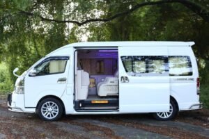 A side view of a sleek and elegant Toyota Commuter luxury van parked against a scenic backdrop, showcasing its stylish design and sophistication